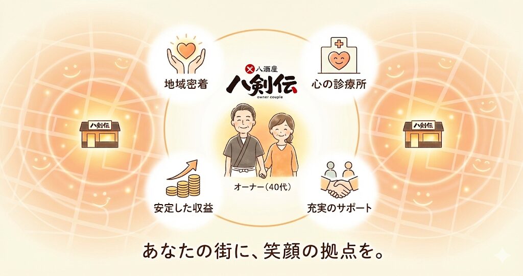 ここまで、八剣伝のフランチャイズについて、ブランドの魅力から具体的な数字の話まで、幅広くお話ししてきました。いかがでしたでしょうか。「居酒屋経営」と聞くと、大変そうなイメージが先行するかもしれません。確かに、楽な仕事ではありません。立ち仕事ですし、夜も遅くなります。
