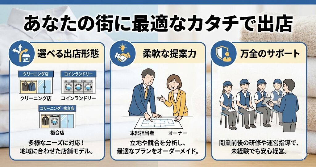 まず最初にお伝えしたいのが、出店スタイルの柔軟性です。ノムラクリーニングでは、オーナー様の希望や物件の条件に合わせて、以下の3つのタイプから出店形態を選ぶことができます。